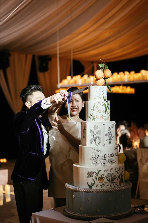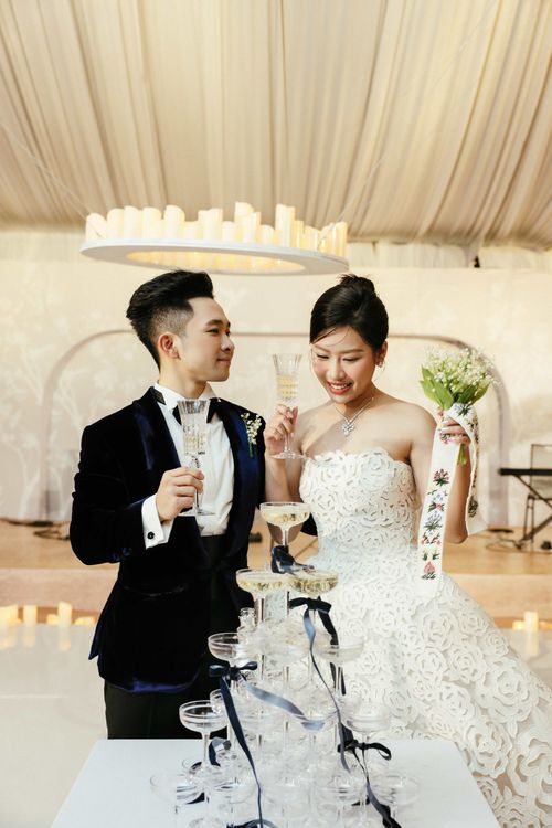 Linh stunned in a rose laser-cut ballgown by Oscar de la Renta, making her the true floral centerpiece of the wedding. Son looked equally dashing in a custom white tuxedo with a satin lapel, paired with black trousers from Vietnam Bespoke Shop.